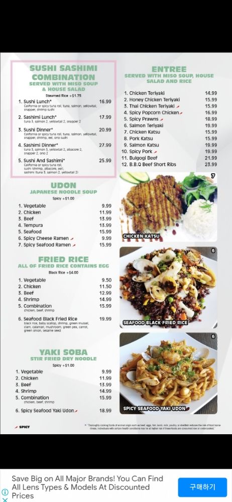 Black rice is available for an additional charge. California or spicy tuna roll (8 pieces). Tempura, salad, miso soup, rice.