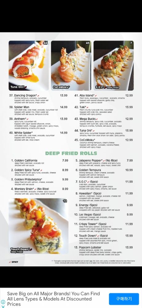 Inside: black rice, super white tuna, spicy crab, cheese, mango, avocado. Top: whole roll panko deep-fried. Sauce: eel, spicy mayo, sweet chili.