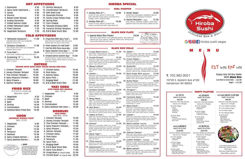 Hiroba Sushi offers a wide range of hot and cold appetizers, soups, and salads for customers to enjoy. From Vegetable Spring Rolls and Edamame to Shrimp Tempura and Yellowtail Carpaccio, there are plenty of options to satisfy any craving. Customers rave about the fresh and delicious sushi, particularly highlighting the truffle blue fin tuna and black rice rolls. The menu has a variety of sushi options, as well as other Japanese dishes like fried rice, udon, and teriyaki. The friendly service and military discounts make dining at Hiroba Sushi a pleasant experience. Whether dining in or ordering takeout, Hiroba Sushi is a hidden gem for sushi lovers looking for quality and consistency in Henderson, NV.