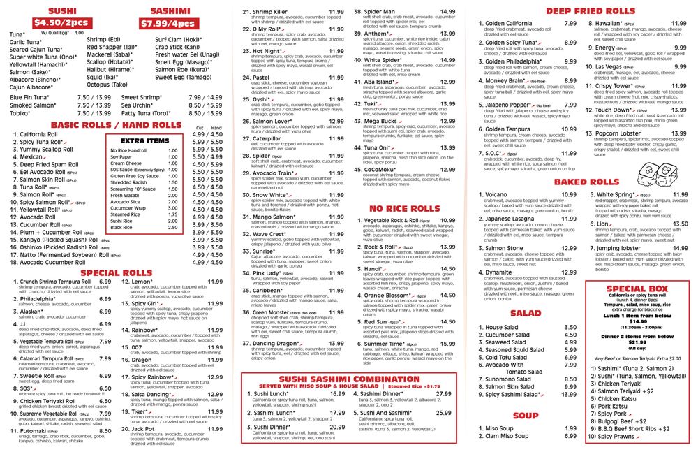 California or spicy tuna roll, tuna, salmon, yellowtail, snapper, shrimp, eel, ono sushi.